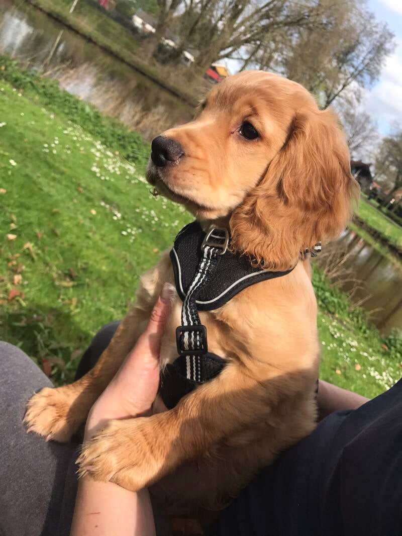 Herman wandelt zonder problemen mee naar buiten. We hebben hem eerst goed laten wennen aan ons binnen en Herman kent het principe buiten omdat de fokker hem dat ook geleerd heeft. Dat scheelt enorm, hij is toe aan nieuwe ontdekkingen. Toch is ons buiten nieuw voor hem inclusief alle geluiden. Bij elk geluid wat een lichte spanning oplevert geven we hem een voertje. De associatie wordt dan moeilijk of nieuw geluid levert mij iets positiefs op. Herman neemt zijn voer aan, dat betekent dat hij ontspannen genoeg is om het een plekje te geven. Had hij zijn voer niet aangenomen, was de stress of angst te hoog geweest. Honden eten niet in een hoge angst of bij stress. Het voer is dan ook een noemer om te kijken of hij inderdaad de situatie aankan.